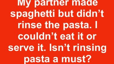 My partner made spaghetti but didn’t rinse the pasta. I couldn’t eat it or serve it. Isn’t rinsing pasta a must?