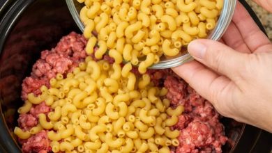 Dump dry elbow macaroni onto ground beef, plus 4 ingredients, into slow cooker for a comforting treat that I plan meals around