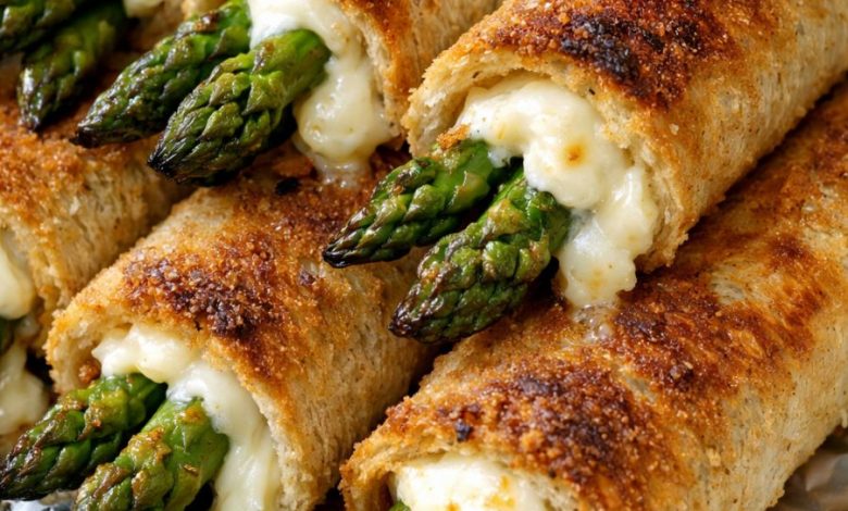 - Place 2–3 asparagus spears at one short end. Roll bread snugly around them, seam-side down on the sheet.