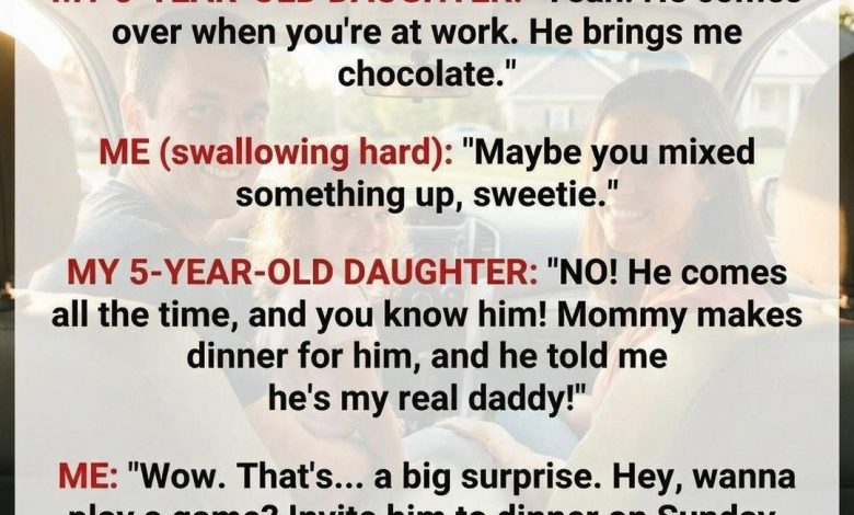 Lily was five—carefree, swinging her legs, oblivious to the way her words tilted my world. She explained it simply: a man sometimes visited when I was at work. He brought chocolate. He sat with Mommy at the table. Sometimes she cooked for him. And he told her he was her “real daddy.”