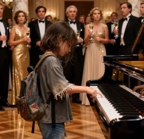 Outside, November air sliced like glass. On the steps of that same ballroom stood a barefoot girl in a threadbare gray dress, arms wrapped tightly around herself. Her name was Lydia. Hunger gnawed at her belly, but her gaze wasn’t drawn to the food or the glittering crowd. It was fixed on the grand piano near the stage — a black Steinway, so polished it seemed to glow.