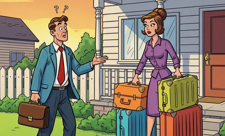 A man came home from work to find his wife sitting on the porch with her bags packed.