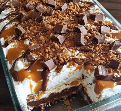 This decadent “poke cake” is incredibly moist, featuring a chocolate base soaked in sweetened condensed milk and topped with fluffy cream, crunchy Snickers, and rich caramel.