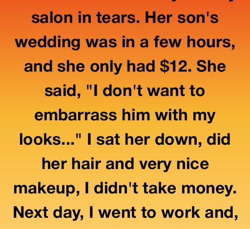 “My son’s wedding is in a few hours,” she whispered. “I don’t want to embarrass him. I have twelve dollars.”
