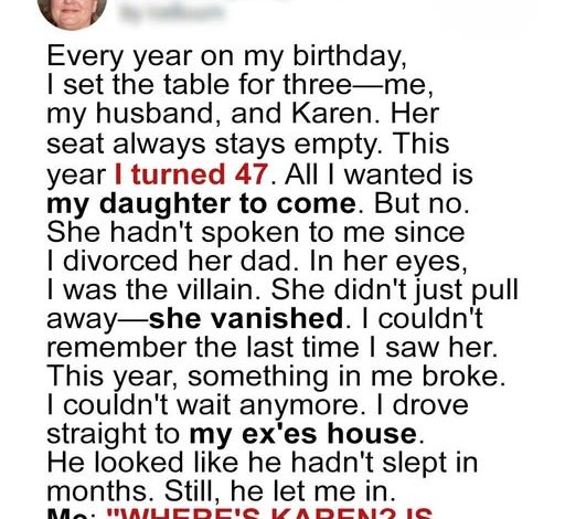 On my 47th birthday, I set the table for three. One seat remained empty, as it had for the past two years—quietly waiting. My daughter, Karen, hadn’t spoken to me in all that time. Still, every year, I laid out her plate, a small act of hope I couldn’t let go of. Brad, my husband, noticed but said nothing. That night, as candles flickered and dinner cooled, I made a silent wish: to see my daughter again.