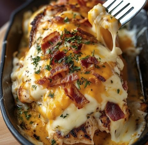 Return chicken to skillet. Top with mushrooms, bacon, and cheese slices.