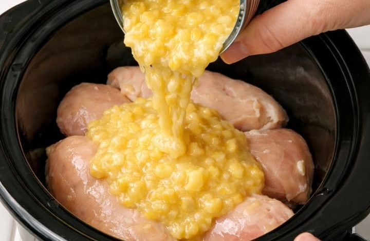 Step 1: Layer the Base: Place the raw chicken breasts in a single layer at the bottom of a 5/6-quart slow cooker. Pour both cans of cream-style corn over the meat, followed by the chicken broth, salt, and pepper.