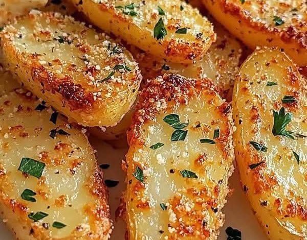 Russet potatoes are cut into fries, tossed with olive oil and minced garlic, baked until crispy, and finished with a sprinkling of Parmesan cheese and garlic powder.