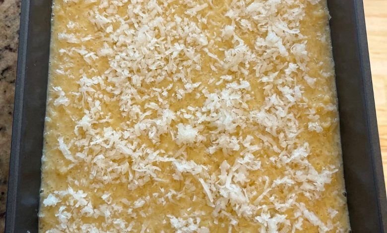 - Step 6: Pouring and Topping: Pour the filling mixture over the cooled crust in the baking dish, spreading it out evenly. Sprinkle the additional 1 cup of shredded coconut over the top of the filling.