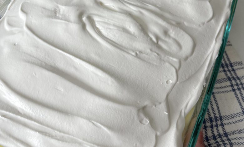 Step 4: The Final Build: Spread the pudding-cheese mixture over the pineapple. Top the entire dish with a thick, smooth layer of defrosted whipped topping.