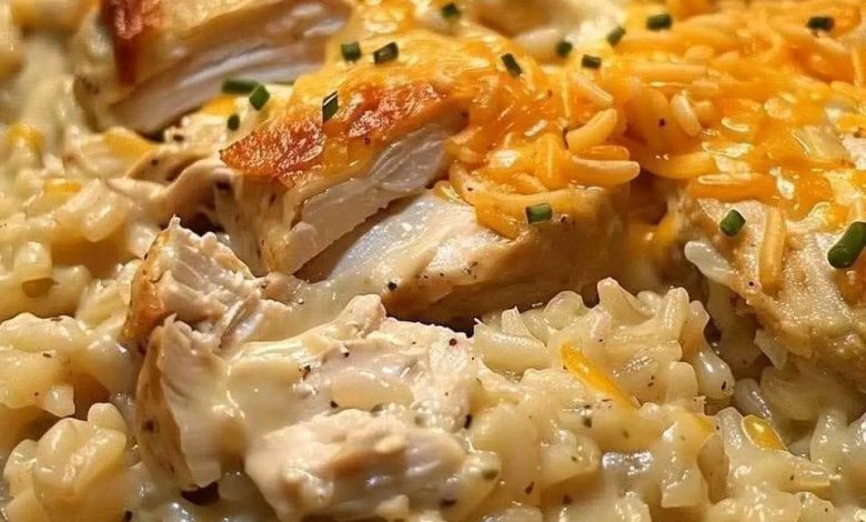 This comforting casserole combines uncooked rice and cubed chicken with a creamy sauce of chicken broth and cream of celery soup, baked until tender and topped with melted cheddar cheese.
