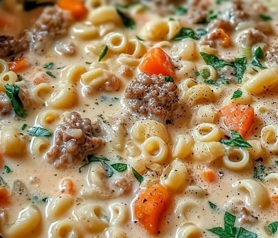 This comforting Italian soup features savory Italian sausage and ditalini pasta simmered in a rich chicken stock, finished with heavy cream and fresh Parmesan cheese.