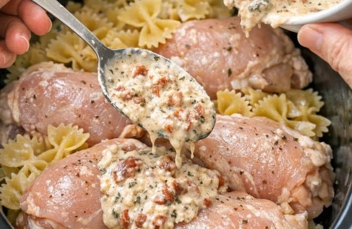 This Slow Cooker Creamy Sun-Dried Tomato Chicken Bowtie is an sophisticated “all-in-one” meal that uses the low, steady heat of the crock to transform dry bowtie pasta and chicken thighs into a restaurant-quality dish. By nesting the chicken over the dry pasta and bathing it in a cream cheese and broth mixture, you allow the noodles to absorb the savory chicken drippings while they hydrate. The oil-packed sun-dried tomatoes and garlic provide a concentrated, Mediterranean flavor profile that cuts through the richness of the cream sauce, resulting in a velvety, tangy, and deeply aromatic pasta dinner.