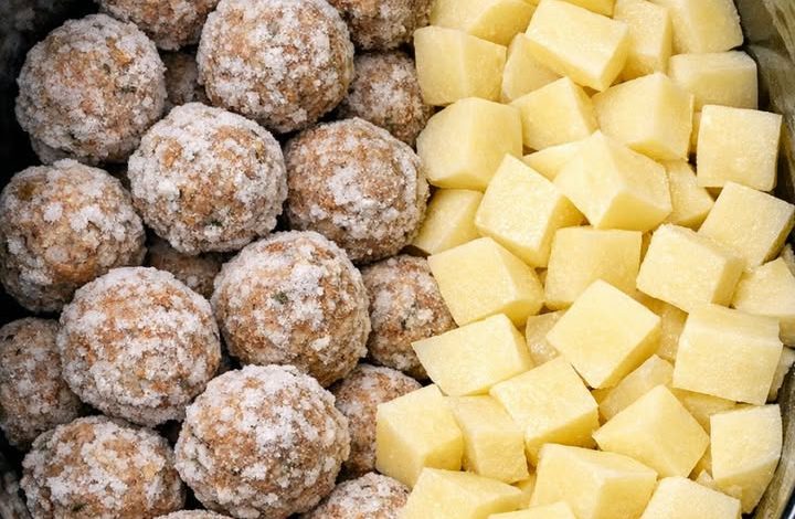 Step 2: Add the Meatballs: Pour the frozen meatballs directly over the potatoes.