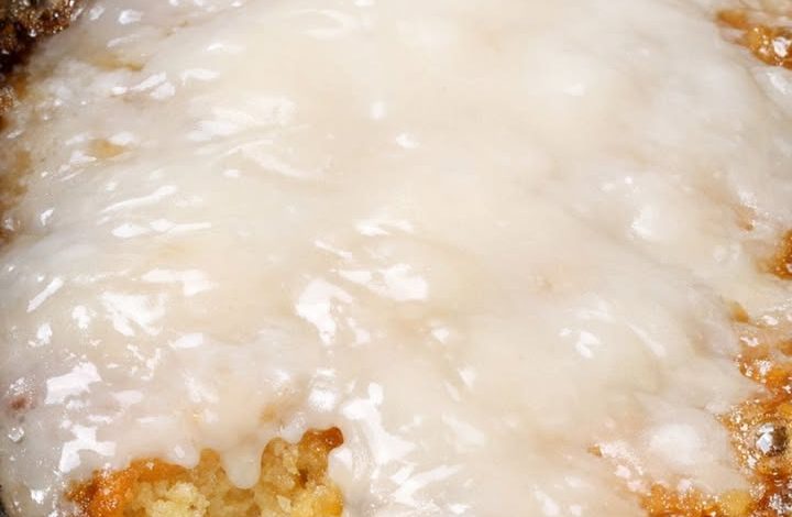 Step 5: The Glaze & Serve: Whisk the powdered sugar with 3/4 tablespoons of warm water until it reaches a thick, heavy cream consistency. Pour it over the warm cake, nudging it toward the caramelized edges. Let it sit for 10 minutes to set before serving.