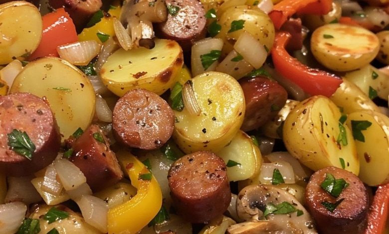 As the final act approaches, bring all the components together in a harmonious union. Combine the cooked onions, peppers, and sausage with the potatoes in the skillet, allowing the flavors to intertwine and elevate each other to new culinary heights.