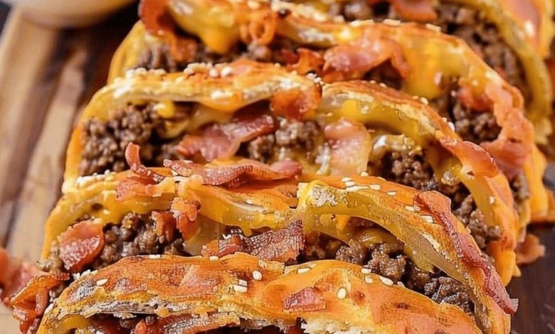 - Layer the Filling: Spread the cooled beef mixture evenly over the dough, leaving a 1-inch border around the edges. Sprinkle the chopped dill pickles over the beef mixture, followed by a layer of American cheese slices.