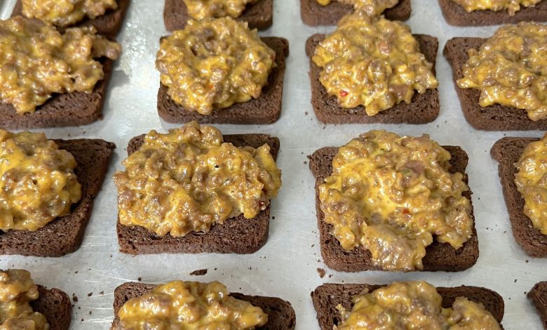 These classic, savory appetizers feature a mixture of ground beef, hot sausage, and melted Velveeta cheese seasoned with Worcestershire sauce and oregano, served open-faced on party rye bread.
