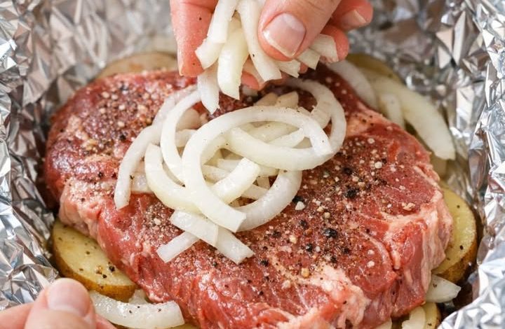 Step 4: Build the Packets: Lay out your foil sheets and create a “bed” of seasoned onions in the center of each. Place one steak portion directly on top of each mound of onions. If there is any leftover oil in the bowl, drizzle it over the meat.
