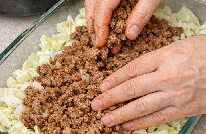 The Mechanical Secret: Instead of forming a solid layer, sprinkle the beef in small, loose clumps over the cabbage. This allows the heat to circulate and ensures the rendered beef fat drips down to “fry” the cabbage shreds below.