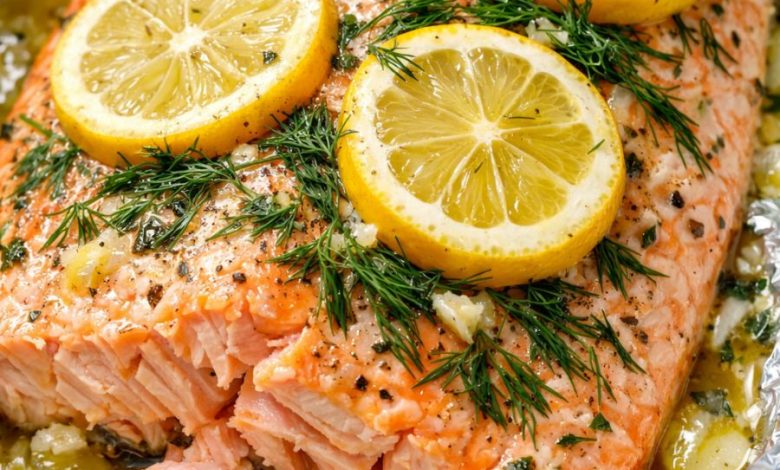 Let rest 3–5 minutes. Garnish with extra dill sprigs. Serve directly from the tray, spooning buttery lemon‑dill juices over each portion.
