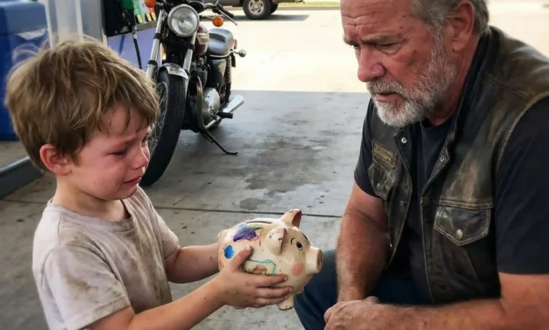 The little boy offered his piggy bank to the biker at the gas station and said six words that made my blood run cold: “Please make my daddy stop hurting mommy.” He was maybe five years old, holding a ceramic pig covered in crayon marks, tears streaming down his face. I’d just finished filling up my Harley when I felt small fingers tugging on my vest.