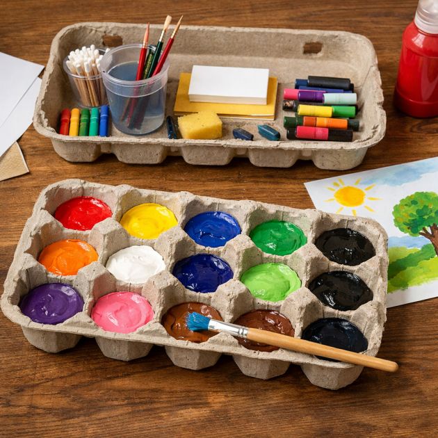 For parents or teachers, “cardboard egg cartons can be converted into paint palettes” very easily. Each deep cup is great for holding a different color of wet paint. This keeps colors separated so “each cup can hold a different color of paint,” making it much cleaner for kids to work on their art.