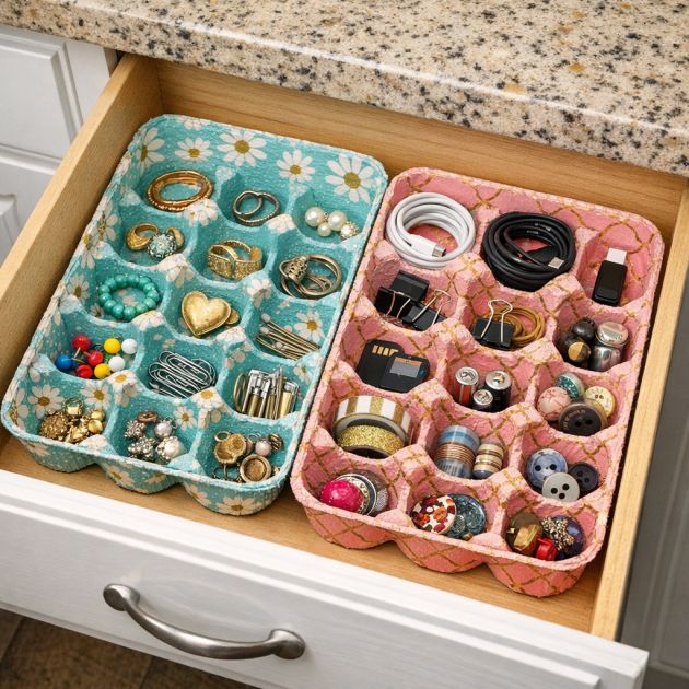 If you have a “junk drawer” filled with loose items, egg cartons are a lifesaver. You can “transform egg cartons into drawer organizers by cutting them to fit” exactly where you need them. They are the perfect size for “small items like jewelry, office supplies, or electronic cords” that usually get lost.