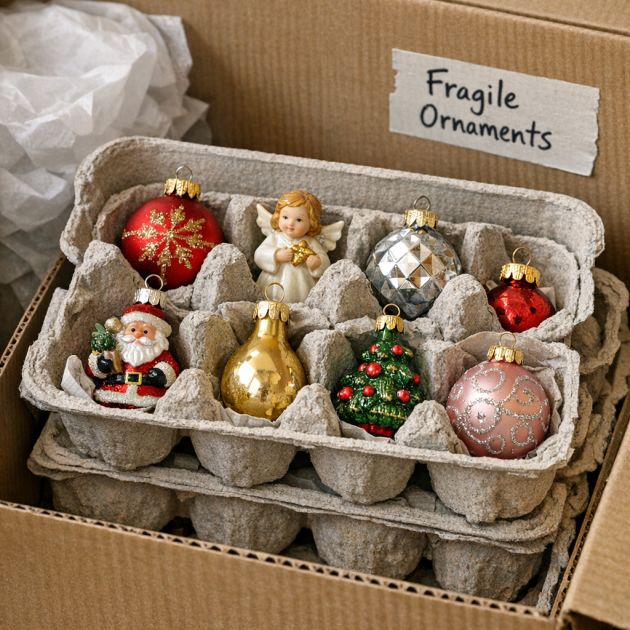 When the holidays are over, “store fragile ornaments safely by placing them in egg carton cups.” The soft cardboard provides “cushioning and protection” for small glass bulbs or handmade decorations.