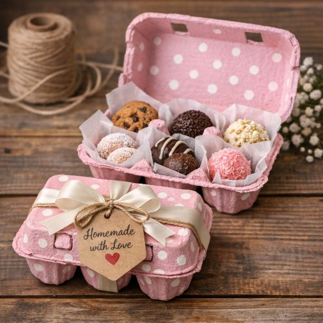 You can turn an old carton into “homemade gift packaging for baked goods and small presents.” If you have made small cookies or candies, “each cup can hold a different color” or flavor of treat.