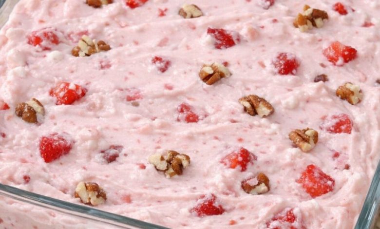 Step 3: The Fruit and Nut Toss: Gently fold in the finely diced strawberries and the 1/2 cup of chopped pecans. The strawberries will naturally release a tiny bit of juice, tinting the entire mixture a beautiful, pale blush pink.
