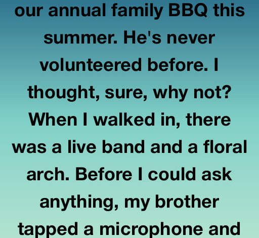 When I arrived at his house, the scene was far from the casual cookout I expected. Instead of folding chairs and paper plates, I saw a “live band and a floral arch.” This setup looked more like a small wedding than a backyard party. Before anyone could grab a soda, my brother took center stage. He tapped a microphone and announced, “I’ve got a little surprise for everyone today.”