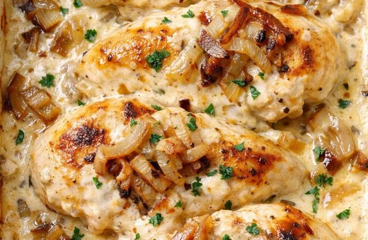This Oven-Baked 3-Ingredient Sour Cream Onion Chicken is a testament to the power of simple, high-fat ingredients to create a sophisticated, “melt-in-your-mouth” texture. By blanketing boneless, skinless chicken breasts in a thick layer of sour cream and a mountain of thinly sliced yellow onions, you create a self-basting environment where the chicken gently poaches in its own juices. As the sour cream thins and the onions caramelize, they emulsify into a tangy, velvety sauce that rivals any complex French reduction.