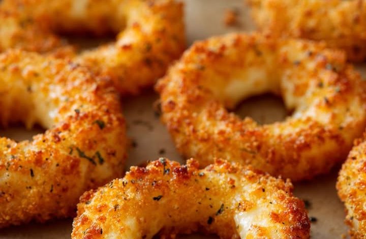 These Cheesy Baked Onion Delights are a fun appetizer that stuffs soft onion rings with melted mozzarella cheese and bakes them under a crispy, seasoned breadcrumb coating.