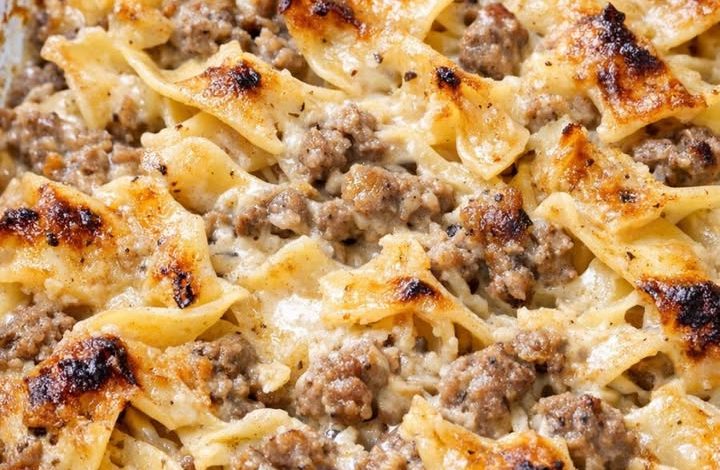 Step 2: The Layering: Lightly grease a 9×13-inch glass baking dish. Spread the uncooked egg noodles evenly across the bottom, then scatter the browned beef over the top.