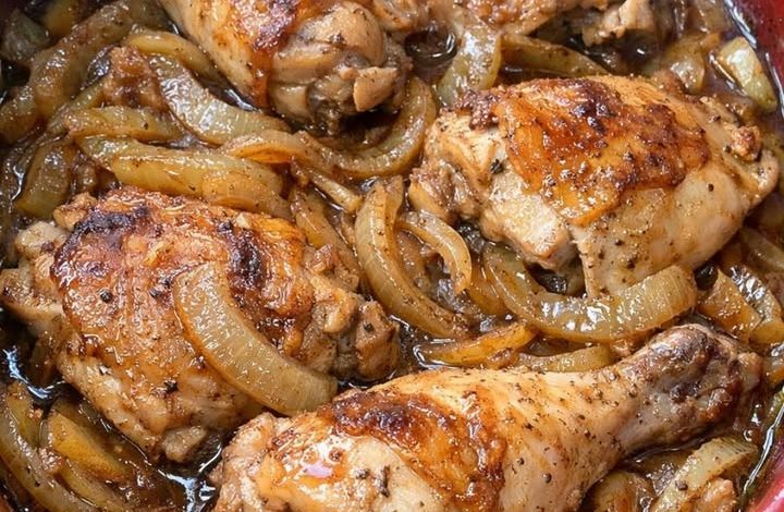 Step 4: The Sauce Integration: Gently lift the chicken out. Stir the onions and the accumulated juices together to emulsify the rendered chicken fat into the sweet onion liquid.