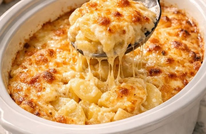 This Slow Cooker Velvet Potato Bake is a rich, deconstructed take on traditional “funeral potatoes,” offering a dense and creamy texture that feels both indulgent and nostalgic. By folding frozen country-style hash browns into a “velvet” base of condensed cream of chicken soup and sour cream, you create a thick, stable sauce that doesn’t break down during the slow-cooking process. The sharp cheddar cheese melts into the crevices of the diced potatoes, resulting in a cohesive, cheesy casserole that is as sturdy as it is soft.