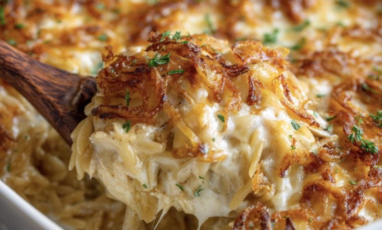 This dish blends the elegance of French cuisine with the simplicity of a casserole. Orzo pasta is the secret star — soaking up every bit of flavor from golden onions, garlic-infused broth, and a touch of cream. The result? A bubbling, golden bake that tastes like it simmered all day, but comes together with surprising ease.