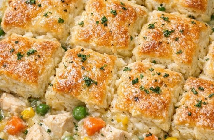 This 4-Ingredient Chicken Pot Pie Bake is an exceptionally efficient “shortcut” meal that utilizes a steam-hydration method to cook frozen vegetables directly in a thick, savory base. By topping a mixture of shredded chicken and condensed cream of chicken soup with refrigerated biscuit quarters, you create a functional “crust” that bakes and steams simultaneously. The biscuits act as miniature sponges, soaking up the savory chicken essence from the bottom while developing a golden, flaky exterior from the dry oven heat.