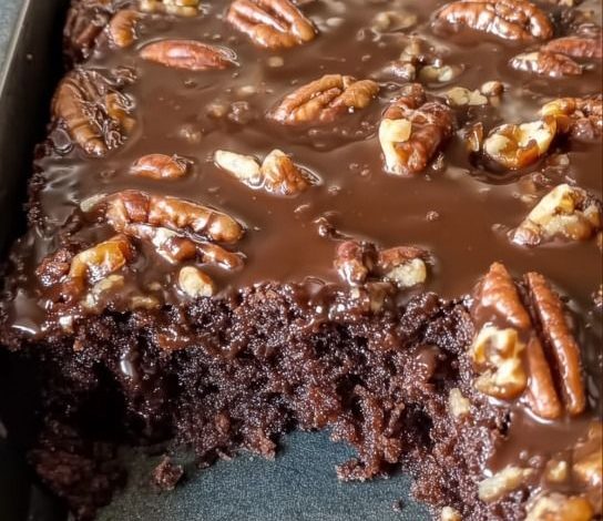 This classic sheet cake features a rich, moist chocolate base baked in a large sheet pan, topped with a quick, warm, fudgy frosting and chopped pecans.