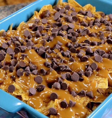 Step 4: Combine: Pour the hot peanut butter mixture over the Fritos in the baking dish. Work quickly to ensure you cover as many chips as possible. Do not stir the chips into the mixture, as this will crush them; simply let the syrup seep down between the layers.