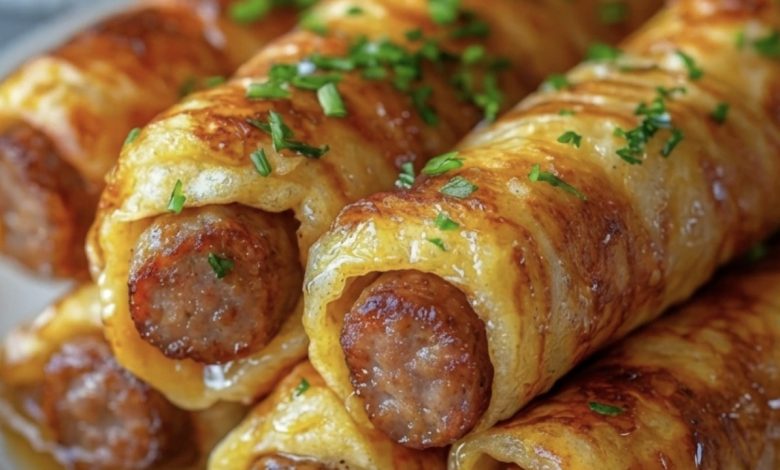 While the pancakes are still warm, place a cooked sausage link in the center of each pancake. Gently roll the pancake around the sausage, positioning the seam side down so it stays wrapped. Repeat this process for all sausages.
