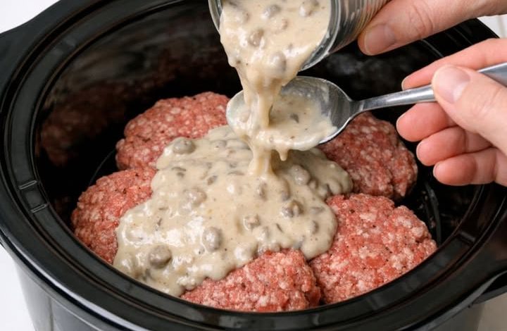 Step 3: Layer the Meat: Lay the raw patties in a single layer at the bottom of the slow cooker. It’s okay if they touch, but try not to overlap them so the gravy can surround each piece.