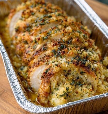 - Uncover and bake an additional 15–20 minutes, until chicken reaches 165°F and stuffing is golden-crisp.