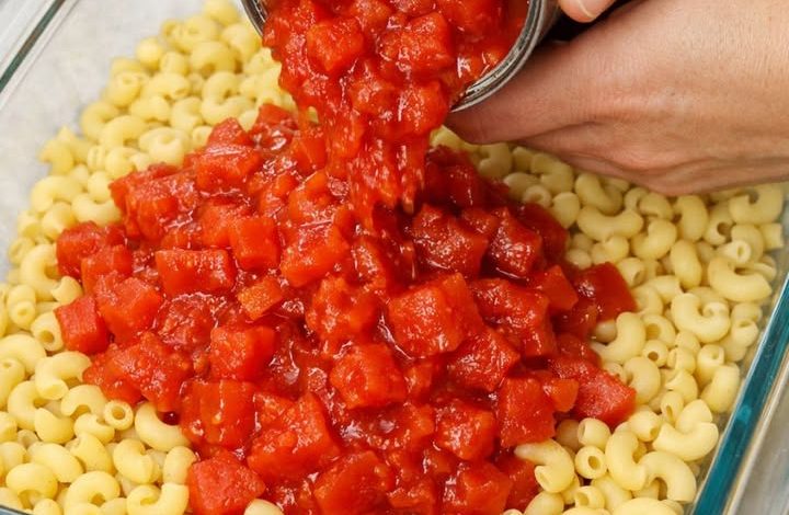 Pour canned diced tomatoes over raw elbow macaroni, together with 2 simple staples, into a glass casserole dish for a rustic dinner that’s the one everyone asks for