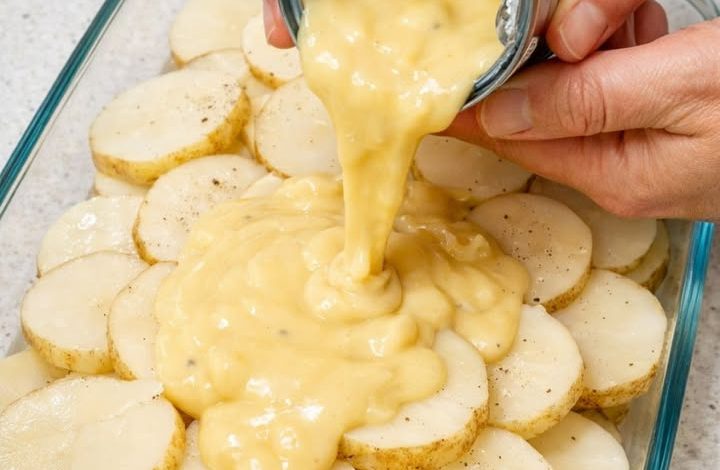 Step 2: The Hydration Slurry: Whisk the condensed soup and milk until smooth and pourable. Pour this mixture over the potatoes, using a spoon to nudge the sauce into the gaps.