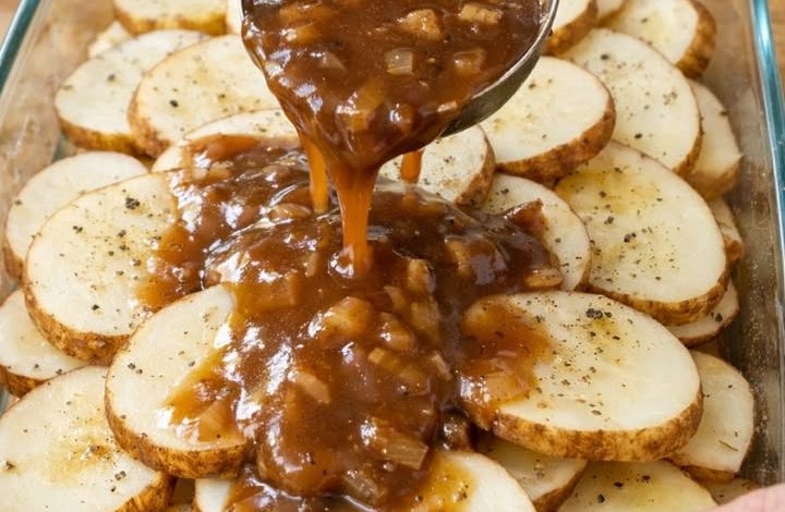 These Oven-Baked Amish Beef Gravy Potatoes are the epitome of farmhouse comfort—essentially a deconstructed “meat and potatoes” dish where the potatoes act like a sponge for the savory beef flavor. By slow-baking the raw slices directly in the gravy, you bypass the boiling step and end up with a texture that is incredibly tender and infused with richness. The addition of those small dots of butter is the “secret” to achieving that silky, homemade mouthfeel that sets Amish cooking apart.