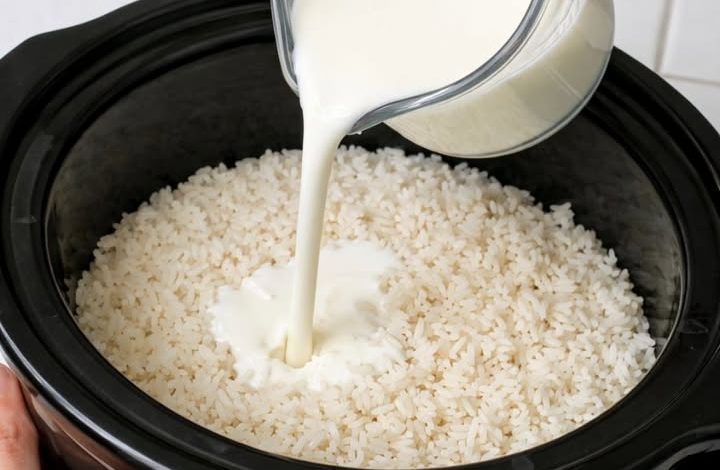 Pour whole milk over raw white rice, paired with 4 ingredients, into slow cooker for a comforting dessert that’s my default when I don’t know what to make