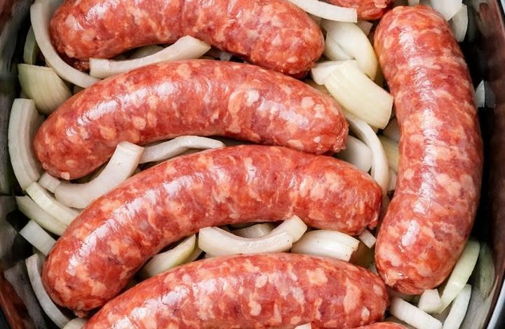 Step 2: Add the Protein: Nestle the raw sausage links on top of the onions.