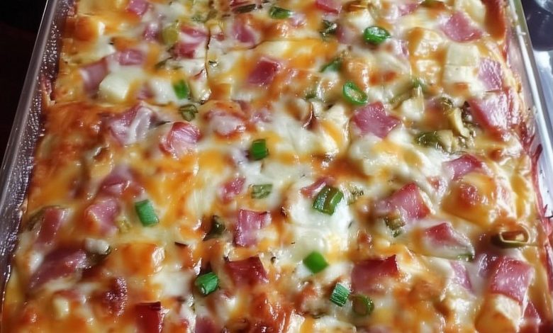 This is a hearty, overnight-friendly breakfast casserole featuring a base of hash browns, diced ham, and cheese baked in a creamy, savory custard.